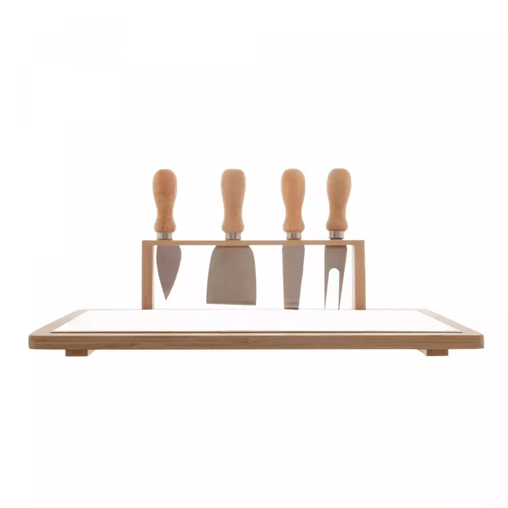 Eleve a experiência de degustação de queijos com o Conjunto Bandeja de Bambu e Cerâmica, acompanhado por 4 Peças para Queijo de Aço Inox com Cabo de Bambu. Este conjunto é a fusão perfeita de elegância, funcionalidade e estilo para encantar seus convidados.
